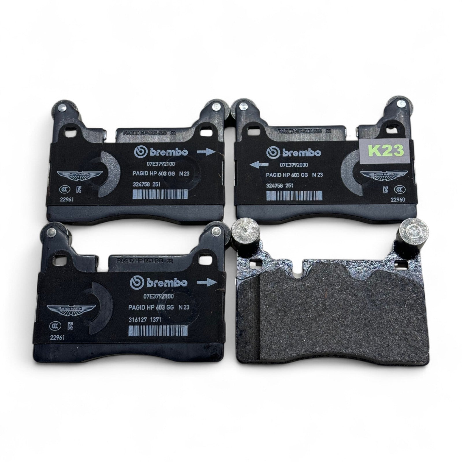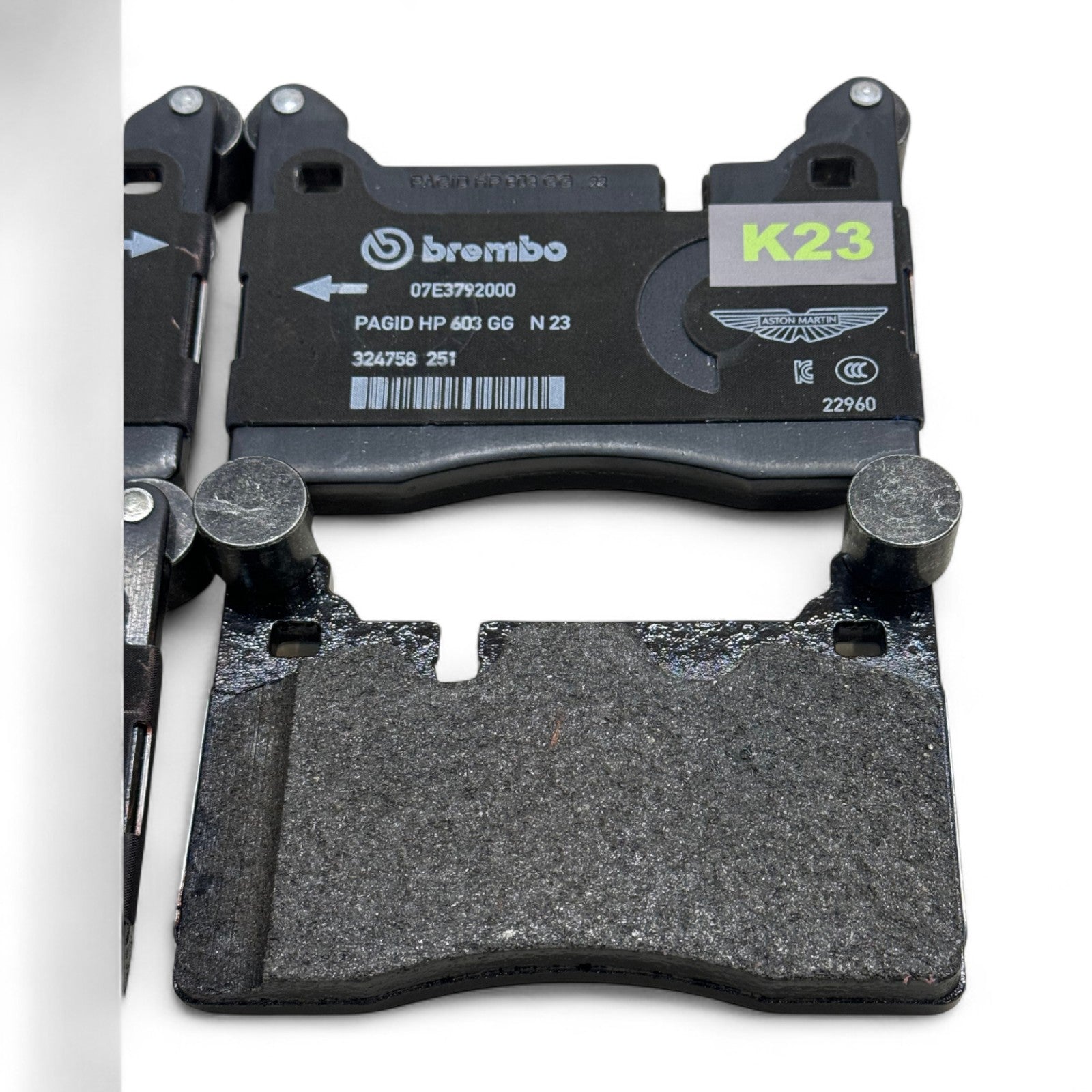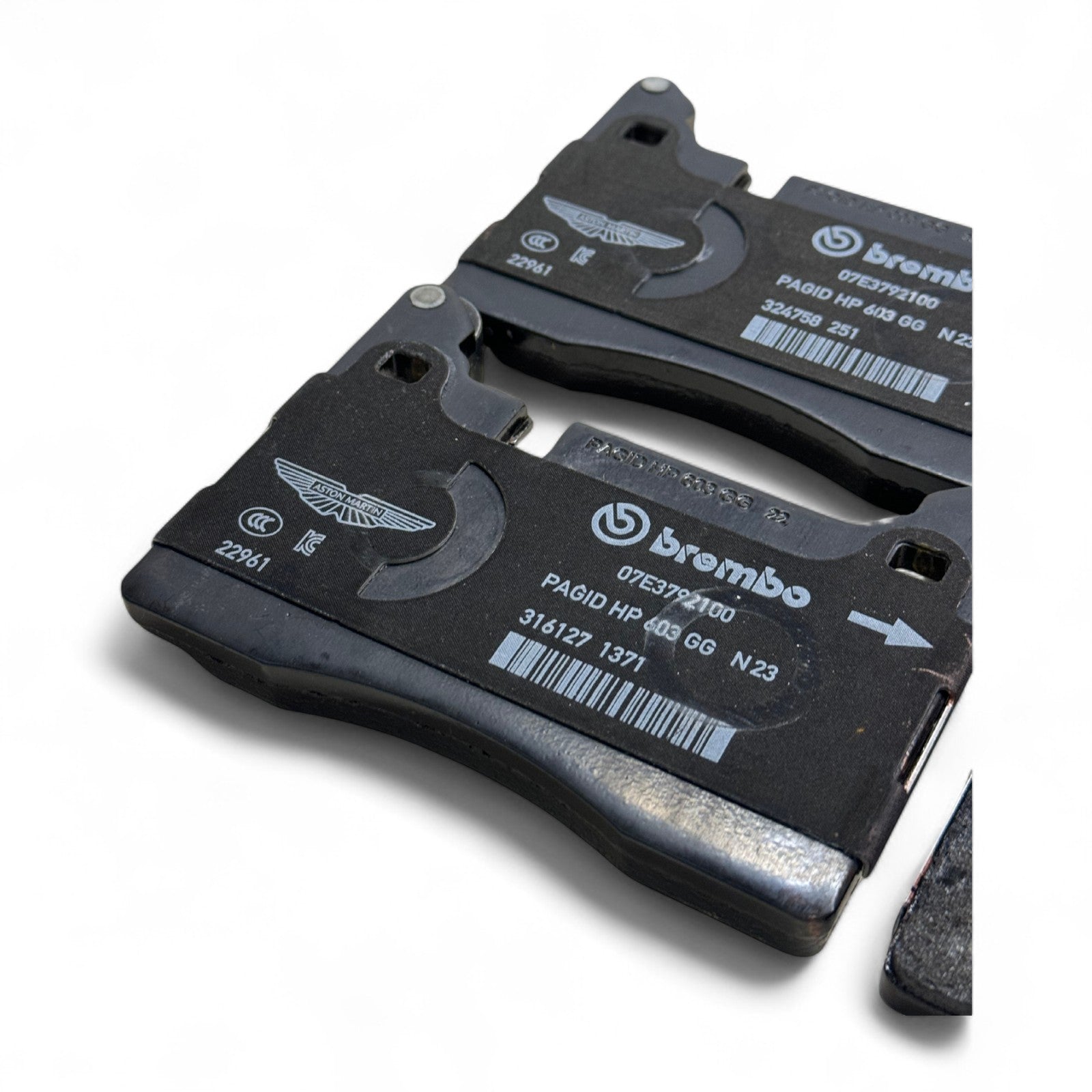 Fabrycznie nowe tylne klocki hamulcowe Brembo do Aston Martin, przeznaczone wyłącznie do samochodów wyposażonych w tarcze stalowe.