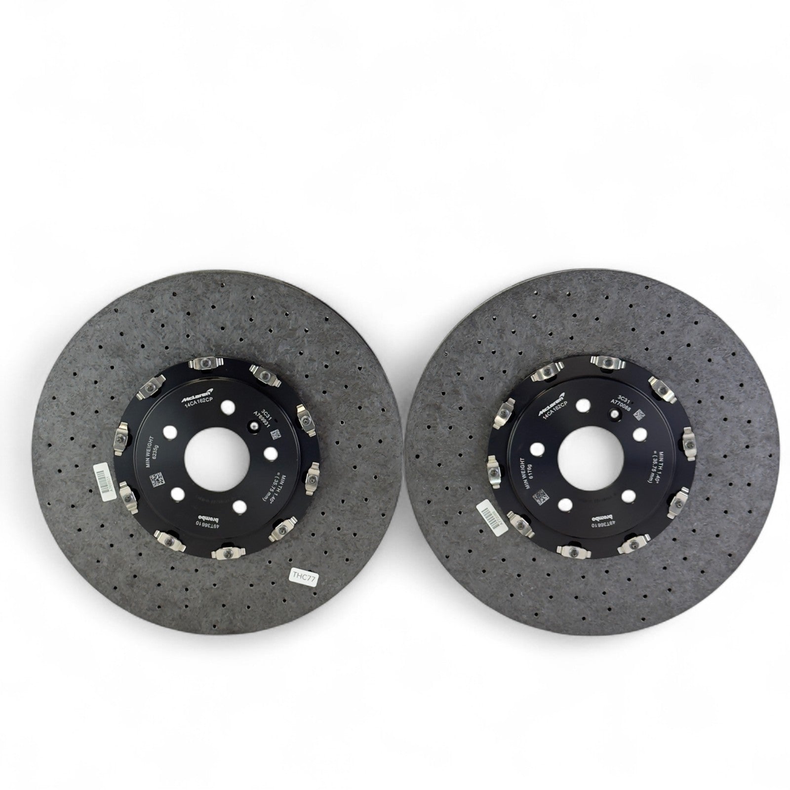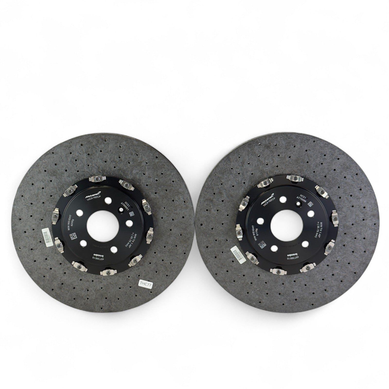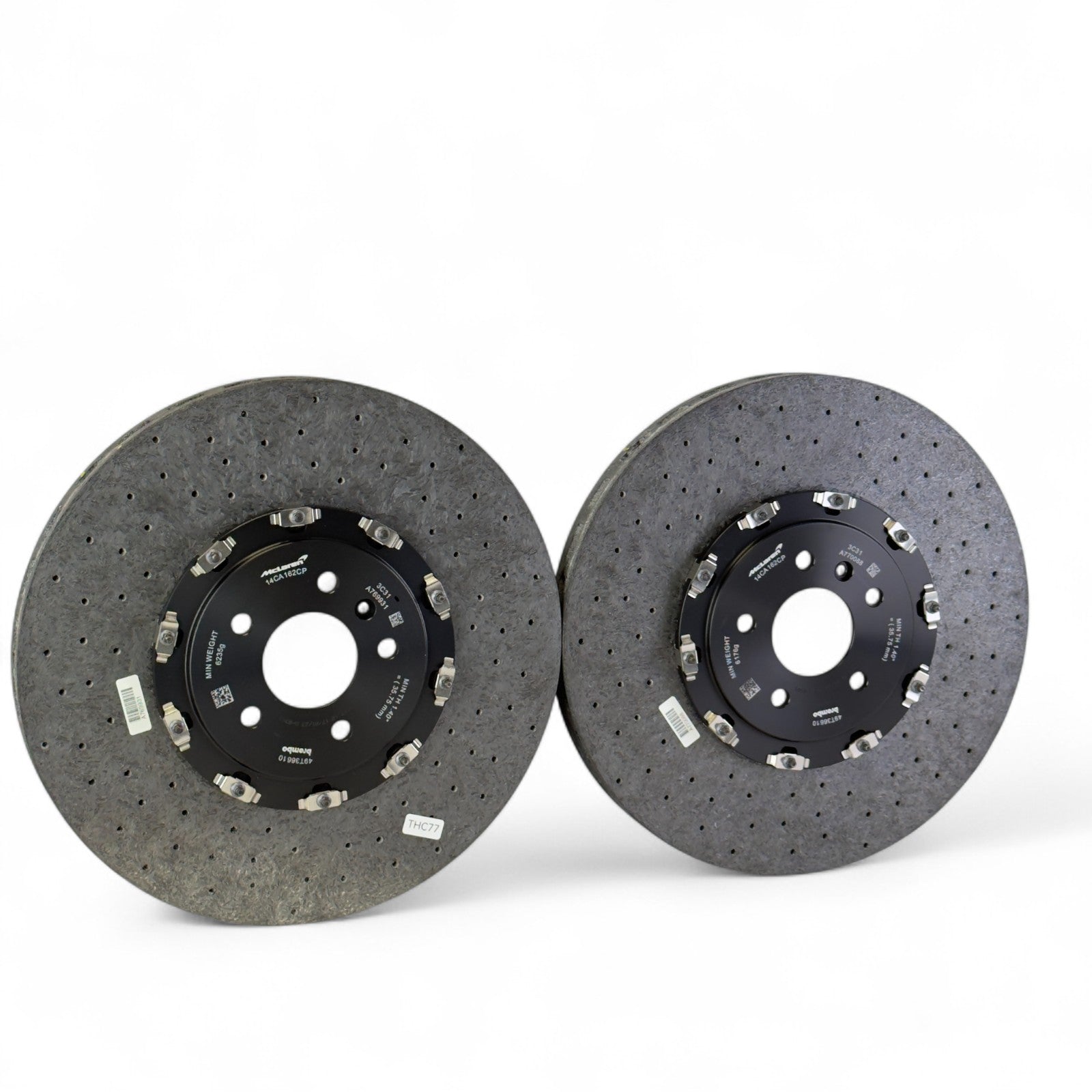 Fabrycznie nowe, oryginalne przednie tarcze ceramiczne McLaren, pasujące do podanych modeli. Produkt oryginalny, nie regenerowany. Jedna tarcza posiada uszczerbienie z przodu.